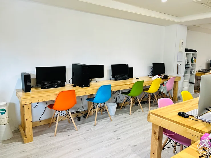 iPadが置いてあるので、自分の名前をタッチすると出勤完了です。ネームプレートとスリッパを身につけて、好きな場所に座ってください。座席は決まっているわけではないのですが、パソコンに保存してあるデータがあったりするので、皆さんやはりなんとなく場所が決まってきます。USBなどに保存しておけば、移動しやすいと思います。PC作業の人は、そこで1日4時間パソコンと向きあって、作業をします。
